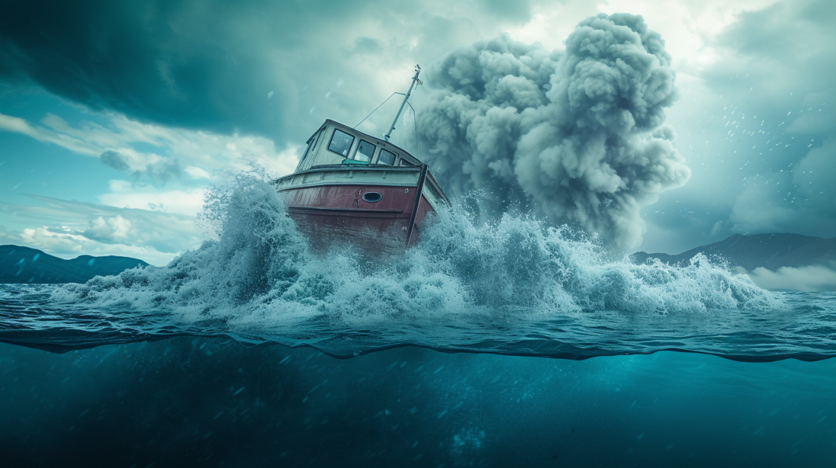 12h 30 m on 24th September 1952. There were no eye-witnesses to the tragedy, and all 31 lives on board were lost. A tide gauge at Hatizyo-sima Weather Station, 120 km north Myozin-syo, recorded a tsunami at 12h 53 m, which had traveled for 28 minutes from the volcano. US Navy hydrophones in Hawaii measured underwater sounds from the explosions.