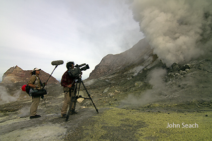 Filming roaring fumarole inside White Island volcano crater 2011.